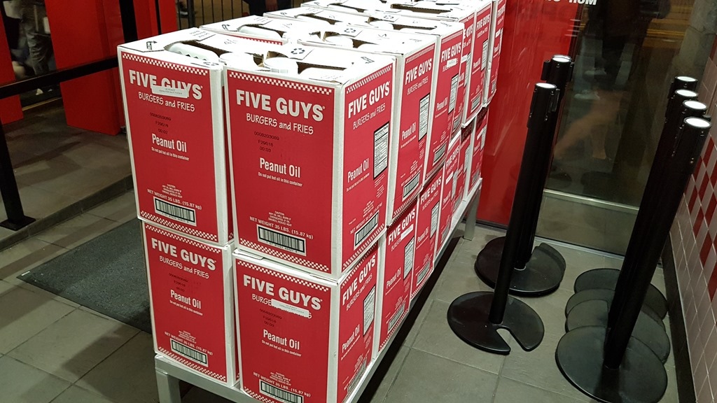 第一次在速食店店內看到這麼多桶裝花生油,因為Five guys的訴求是新鮮現做、有機原料,材料也新鮮直送,人氣這麼旺,食材應該也沒有辦法放太久,入口處看到那知名、提供給客人無限取用吃到飽的花生,一箱箱的,但沒拍下也忘了裝來吃了,不知道口味怎麼樣。