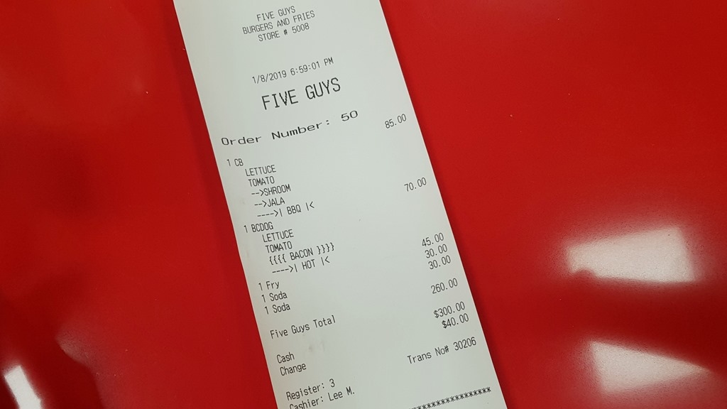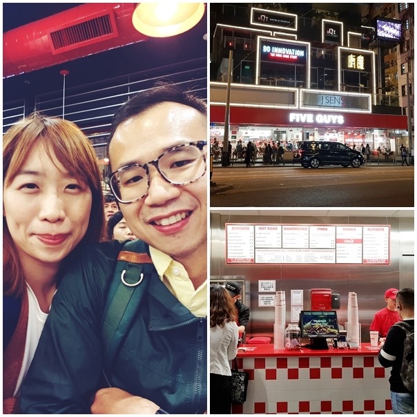 Five Guys不管是漢堡或是熱狗的皮都是偏軟的,整體算好吃但價格偏高,尤其我們又各點了一杯飲料(港幣30元/每杯),一杯台幣破百的可樂是只有在搭飛機出門才會有的衝動。結論是我們可以把漢堡和薯條縮小一個尺寸、飲料一杯就好,Five Guys的份量都頗大的,但是點太大杯的薯條並非不好吃,相反的薯條超好吃的,驚艷度讓我感到超越了三明治漢堡,也許是新鮮馬鈴薯、也許是因為100%的花生油。